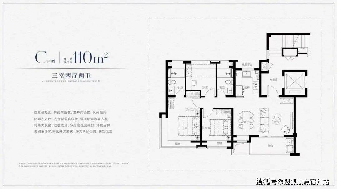 此户型在103㎡户型的基础上,将南向主卧、北向次卧均升级了约270°转角飘窗设计,采光视野及美观性都得到了极大提升。