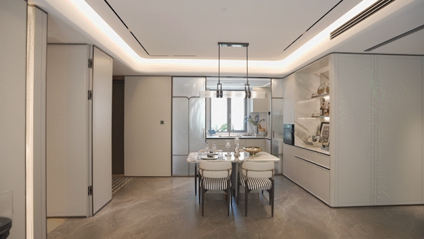 厨房方面,项目全系标配中西厨搭配,中间用无地面链条设计的海派金属玻璃移门隔开,使厨房地面与客厅打通,通铺的简一地砖,