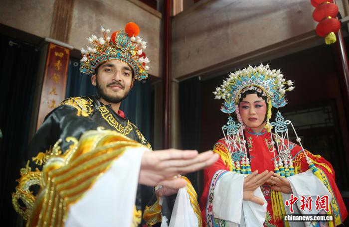 斗南社区古戏台前,滇剧演员水袖翻飞,唱腔婉转悠扬。台下的青年们陶醉其中,目不转睛地观看表演。随后,他们从观众变身“戏中人”——穿上凤冠霞帔,学习兰花指、云手等基本身段,模仿咿呀唱腔,沉浸式体验滇剧魅力。