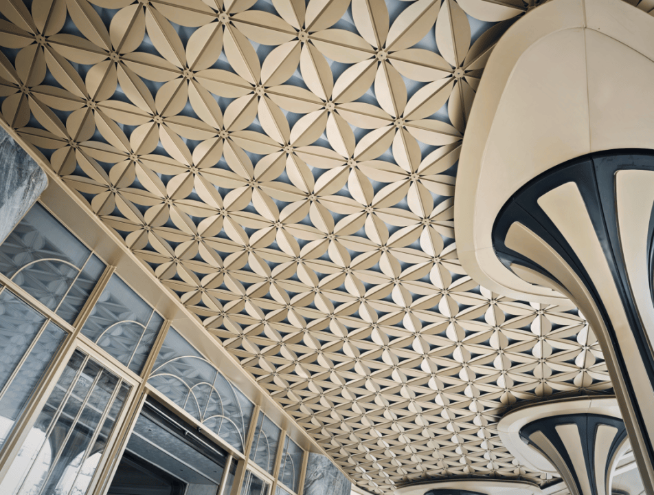 项目门头设计恢弘大气,设计师从“浮岛”中汲取灵感,将立柱化为悬浮雕塑,以自然的秩序与美学,共同勾勒出轻盈而富有仪式感的花瓣造型。