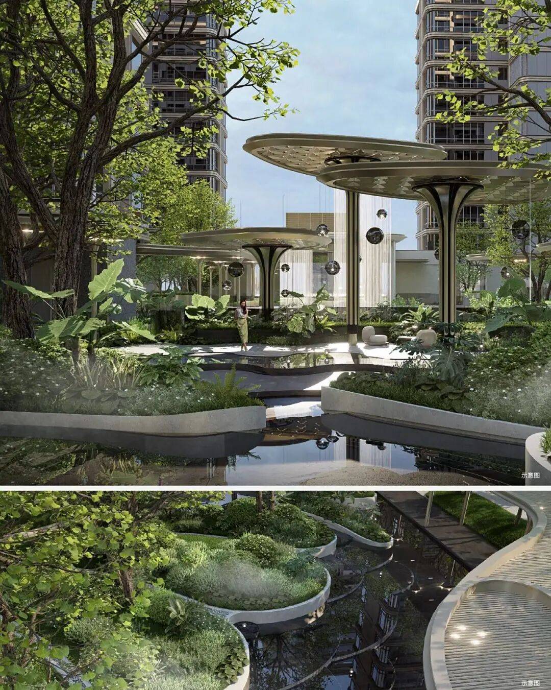 未来社区内整体园林设计仍以“浮岛”概念为核心,通过林岛漫步、循水归岸、闲庭雅致多层次景观布局,四季更迭的花卉搭配香草植物,营造沉浸式森居体验,让视觉与嗅觉共同沉浸于自然诗意。