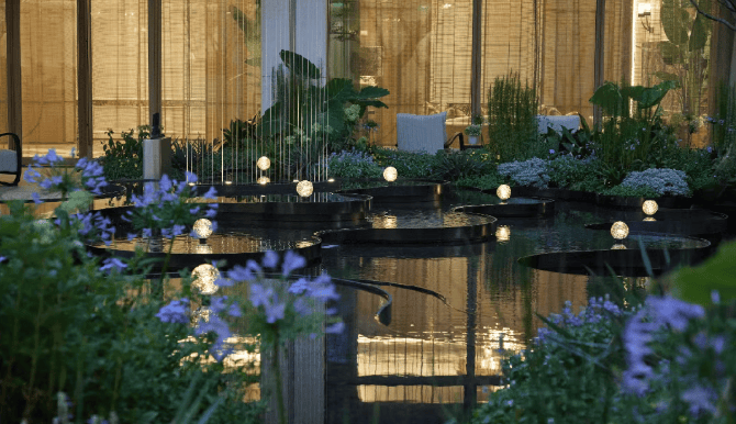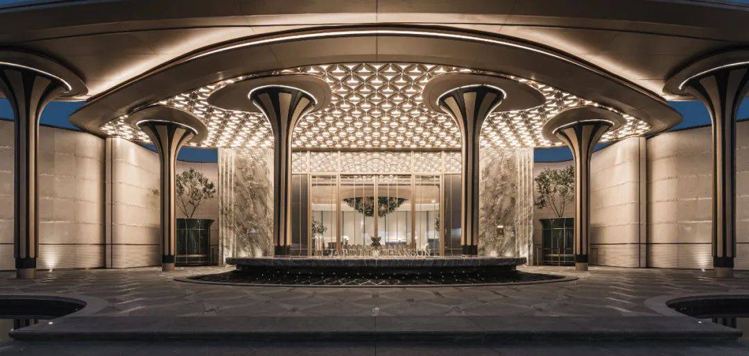 以匠心雕琢光影水韵之美,层叠水景与灯光延展出优雅的序列;以传奇的蒂芙尼蓝为灵感源泉,采用独创的U型玻璃熔铸工艺,将琉璃的梦幻光泽与水的灵动质感完美融合。