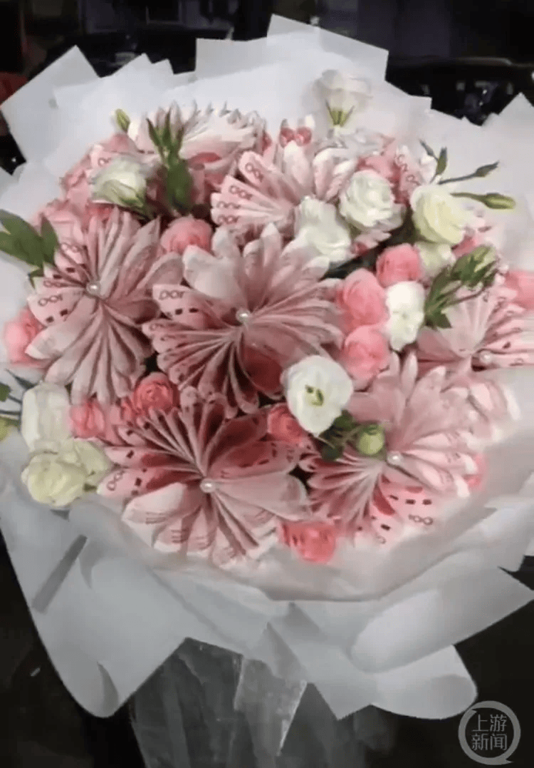 3月27日,杨某前去花店取走预订的“礼物”。由于这两样礼物是由4万元现金组成,十分贵重,花店老板生怕给错了人,不仅为花拍照想要在朋友圈展示下手艺,还特地为前来取走礼物的杨某录了视频留作“证据”。