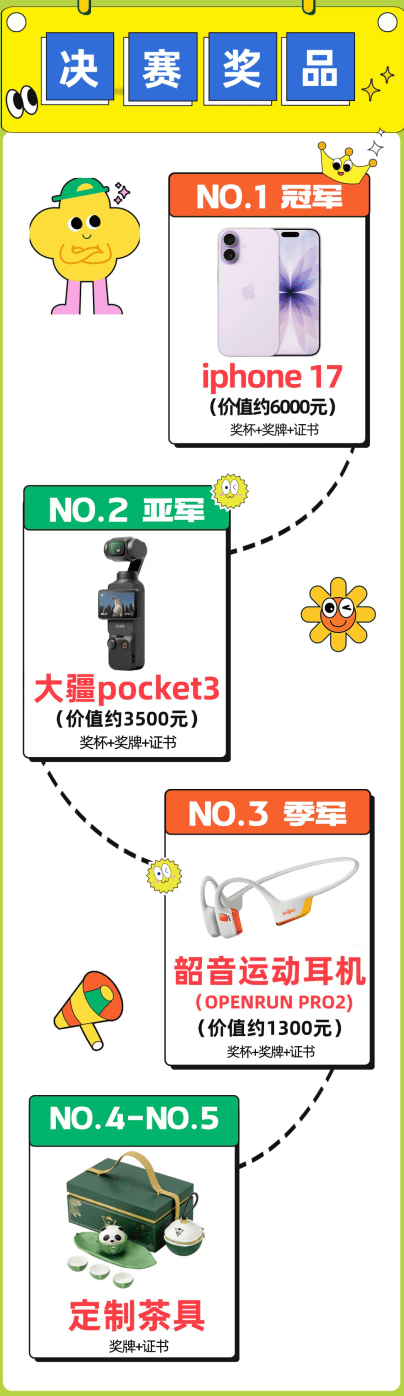 本次冬季锦标赛于1月19日开始报名,每天每组最多可报十个名额,最后每组选取用时最短的前十名进入决赛,决赛用时最短的前四名就可以把大奖抱回家啦!从时下最新的IPHONE17,到潮玩一族必备的POCKET3,活动奖品价值实用双在线,赶紧报名参加吧!