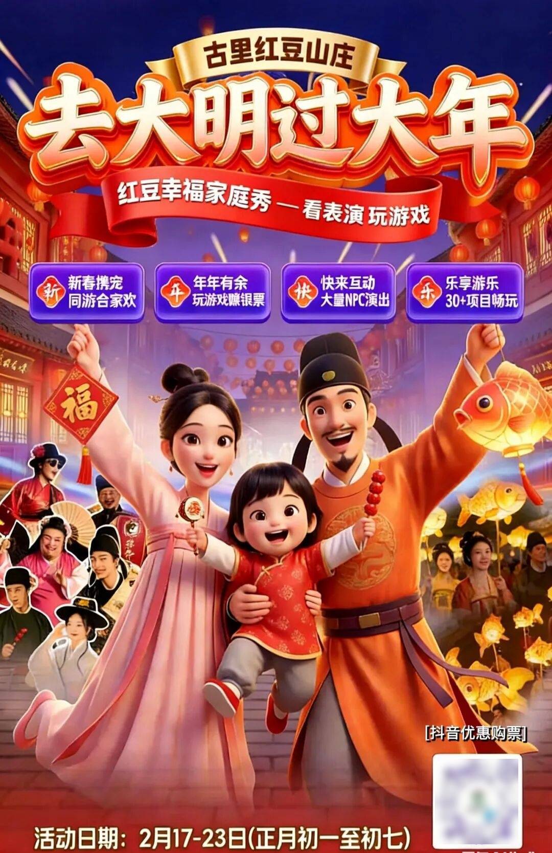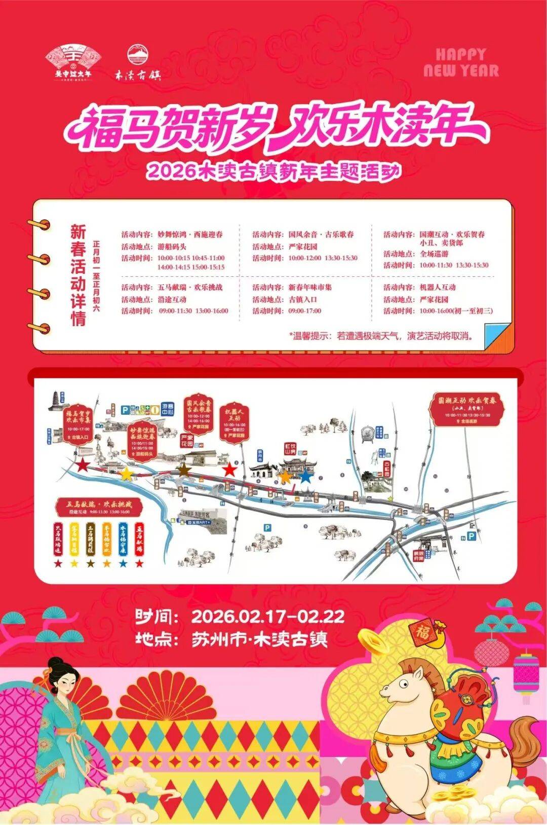 ,推出“马上有财”“马上有喜”“马上有乐”“马上有福”四大板块主题活动,从正月初一到元宵佳节,银票闯关、状元巡游水乡婚俗、非遗展演等十余种特色活动轮番上演,邀你奔赴粉墙黛瓦的千年水乡,沉浸式体验最地道的江南年味。地点: