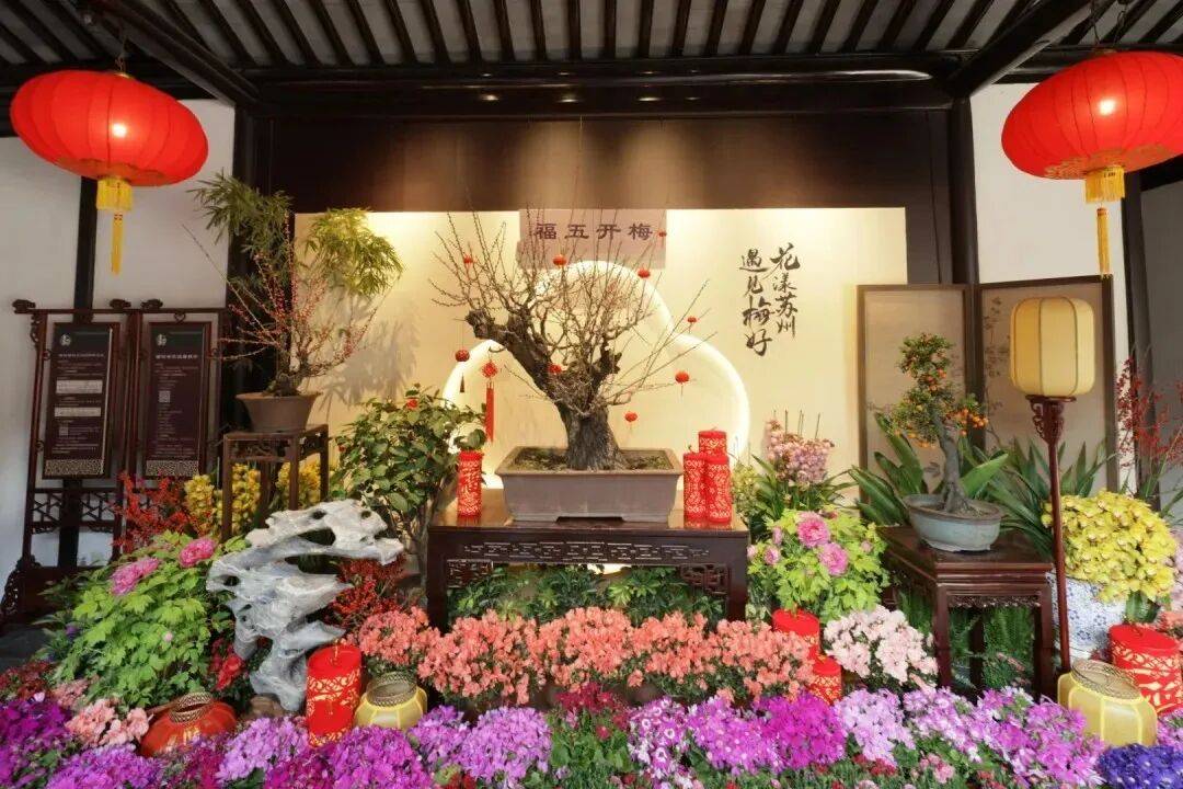 本次主题展以“红梅闹春”为核心,分厅堂雅陈与庭院造景两大板块,以梅桩盆景、艺术插花等为载体,集中展示多品系经典梅桩盆景,尽显梅花盆景艺术与古典园林的共生之美。留园、艺圃入口及园内花坛,以红梅、蜡梅、红果冬青等冬季时令花卉为主角,搭配传统节庆装饰,勾勒出“暗香浮动、年味盎然”的观赏场景。