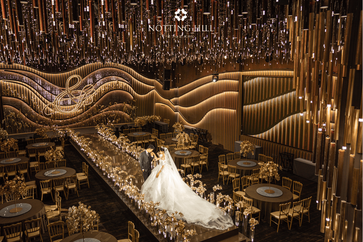 诺丁山婚礼艺术中心设有4大特色宴会厅,全面覆盖4 - 34桌不同宴请需求,6米开阔层高搭配专属主题创意设计,适配各类审美偏好的新人。巴赫序曲可容纳24桌,以咖啡黑与香槟金碰撞勾勒出低调奢华的维也纳格调,精准适配偏爱精致小众、低调质感风格的新人;晶城薇语32桌规模,以海量玫瑰与蔷薇打造沉浸式红色花海,复刻奥赫卡城堡的巍峨质感,复古大气的氛围感直接拉满;晶岩之境同为32桌,暖色调水晶满顶有序排布,打破传统白色水晶的刻板印象,兼顾空间高级感与视觉柔和度;鹿聆之町可容纳34桌,以莫奈庄园为核心灵感,打造粉色系浪漫花园秘境,藏有精灵、飞鸟、南瓜马车等灵动元素,满含少女情怀。无论是追求大气复古,还是浪漫清新,在这里都能找到合适的场地。