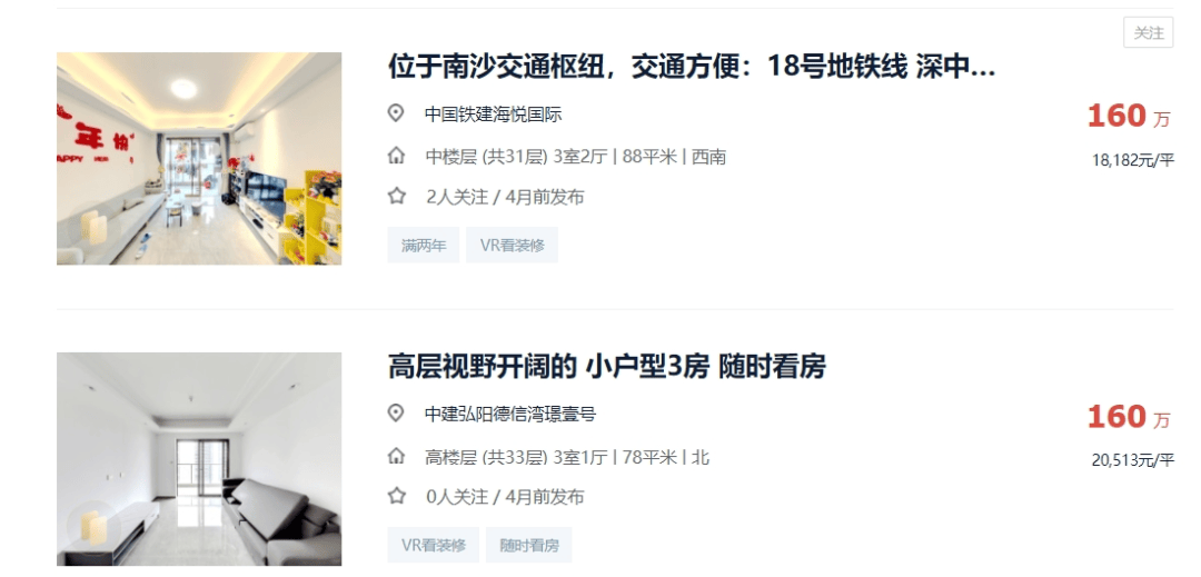 近地铁口的中铁建海悦国际和湾璟壹号,最新二手挂牌在1.8-2万/平之间,价格还是比较坚挺。