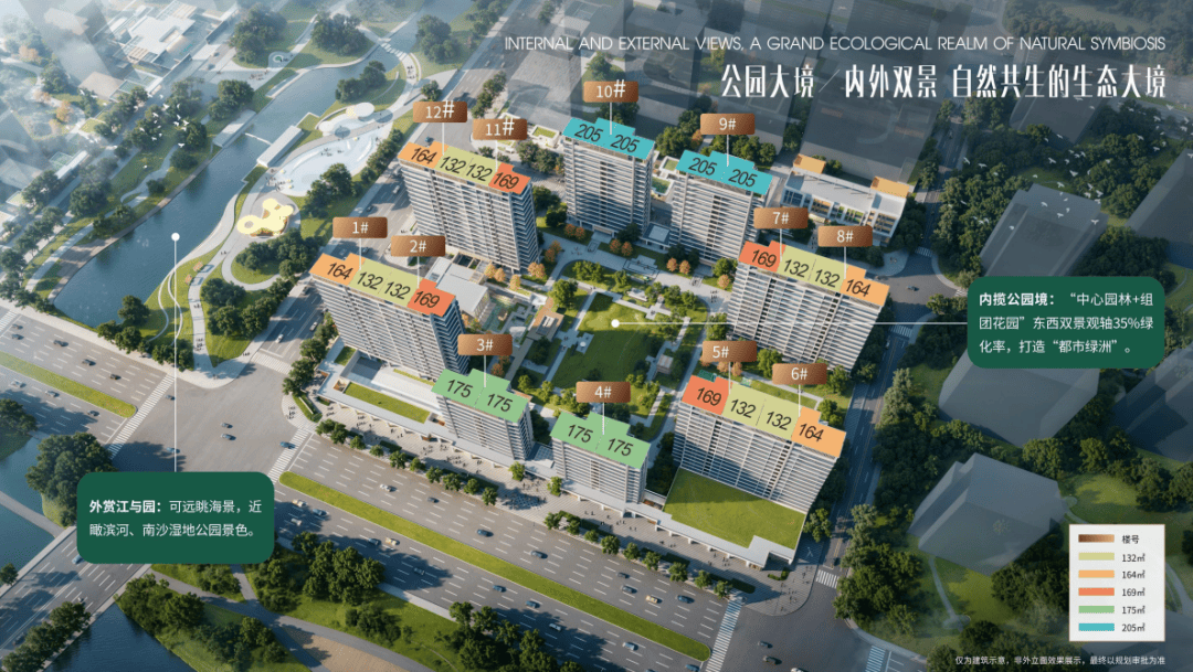 户型方面,均为纯南向板楼大平层:分为132㎡、164㎡、169㎡、175㎡、205㎡。