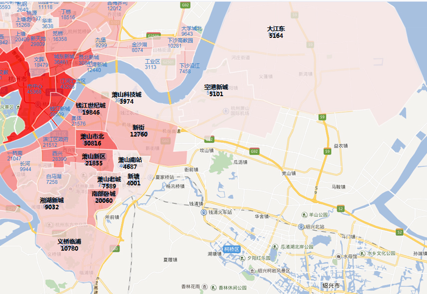 从上图中可以看出,仅大江东、空港新城、萧山科技城、萧山南站、新塘、萧山老城、湘湖新城7个板块地价尚未破万。但值得注意的是,7个板块中的部分板块,如新塘、萧山科技城、萧山南站等,并非因为无人竞争而地价低,久未出地才是导致其地价未跟上市场脚步主要原因。