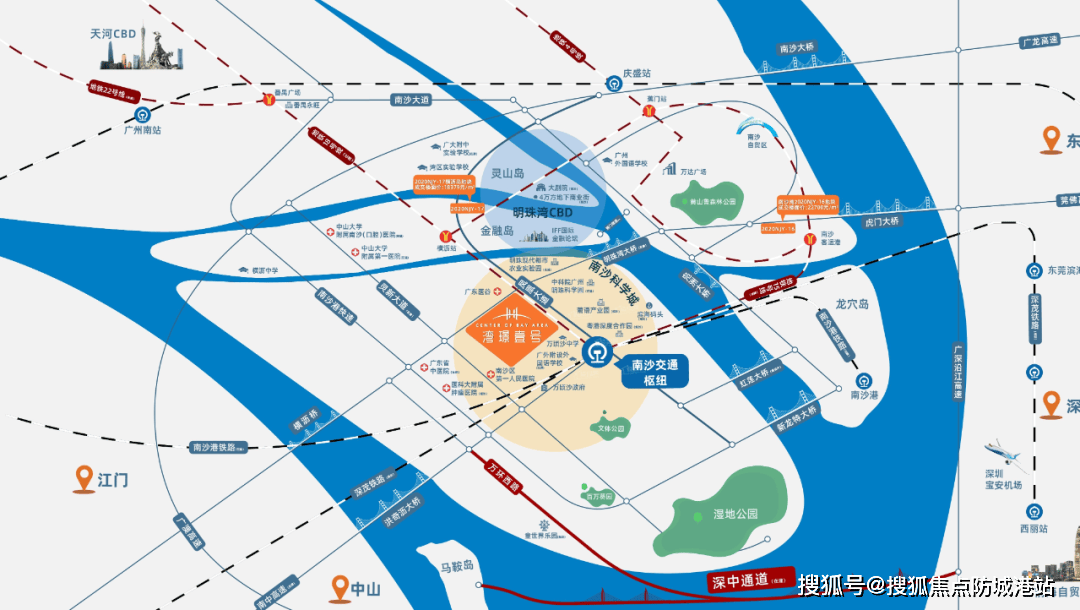 中建·湾璟壹号雄踞南沙枢纽区块,地处粤港深度合作区与万顷沙综合生活服务区核心。项目距广州地铁18号线公里,是目前南沙在售楼盘中距离轨道站点最近的项目之一。18号线分钟直达珠江新城,通勤效率远超传统地铁。未来更将串联深中通道(预计2024年通车)、深茂高铁(2站达南山西丽科学城)、广深港磁悬浮(规划中,时速600公里)等国家级交通动脉,形成“2高铁+1铁路+3城轨+2地铁”共8轨交汇的超级枢纽,密集度堪比广州南站。同时,项目紧邻明珠湾大桥、凤凰大道及“两横四纵”干道网络,10分钟车程即可抵达横沥岛CBD,真正实现“一桥连三城,半小时融湾区”。